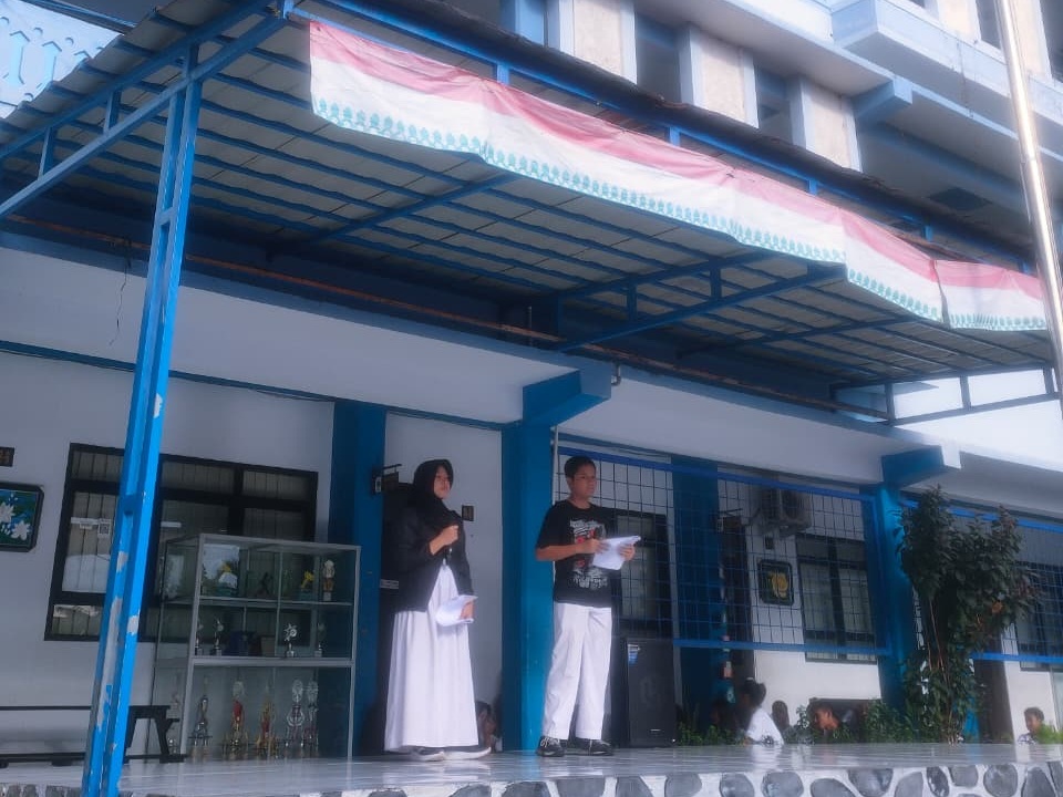 Pembawa acara/pengisi materi tampil percaya diri di panggung beratap biru. Mereka membacakan materi dengan lantang menggunakan pengeras suara, menunjukkan keterampilan berbicara di depan publik yang telah diasah. Nuansa Merah Putih pada dekorasi panggung juga turut memeriahkan suasana, sejalan dengan nilai-nilai nasionalisme yang selalu ditanamkan.