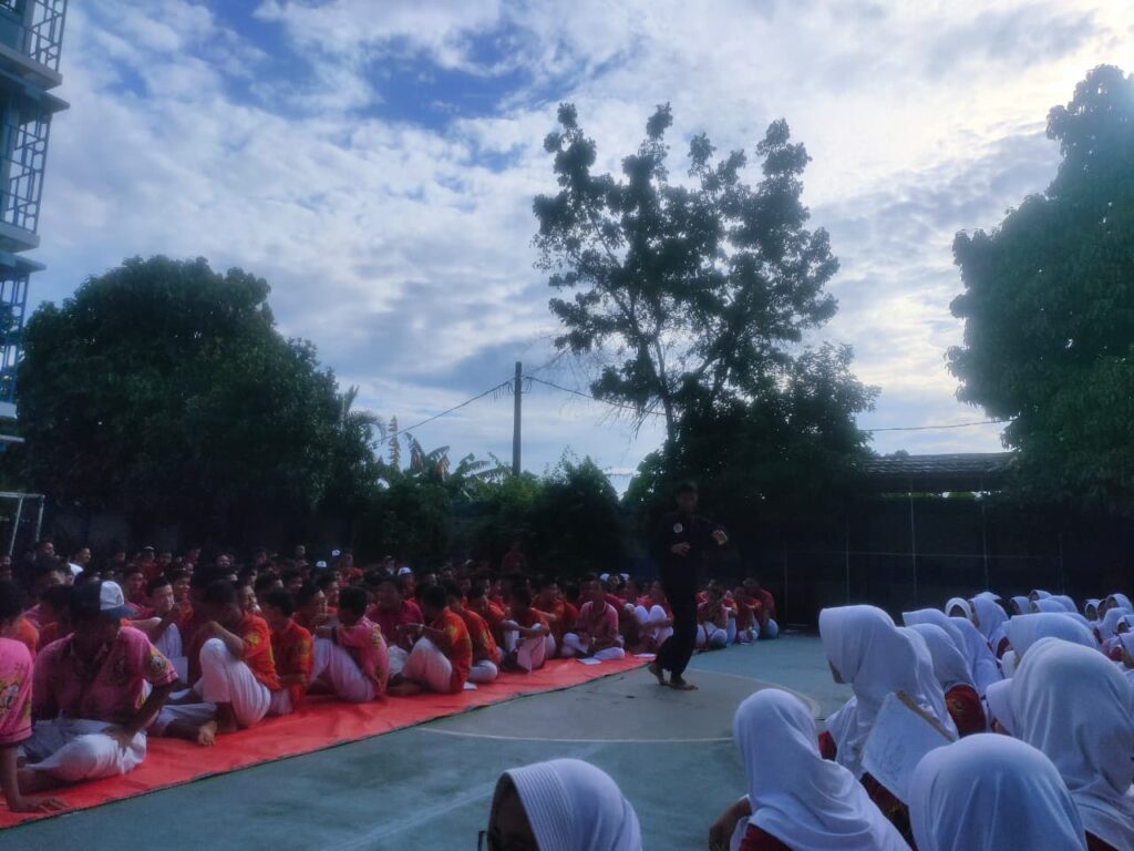 Sebelum puncak acara Literasi, kegiatan Jumat pagi ini juga diisi dengan pembinaan karakter dan doa bersama yang diikuti oleh seluruh siswa dan guru dengan tertib. Dalam gambar, terlihat ratusan siswa yang mengenakan seragam pramuka (putih-merah) dan berbusana muslimah (bagi yang berjilbab) duduk rapi di lapangan sekolah, menunjukkan kedisiplinan dan semangat kebersamaan.