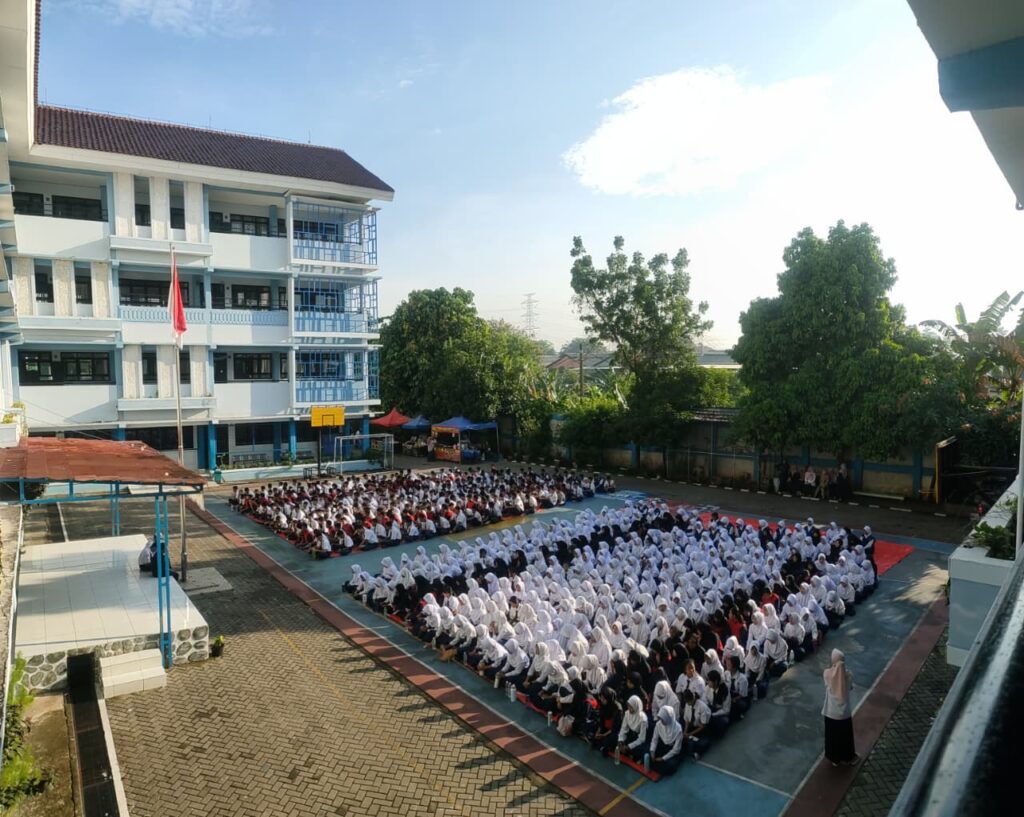 Kegiatan dimulai dengan Pembiasaan Pagi yang bertujuan untuk menanamkan kedisiplinan, spiritualitas, dan karakter baik. Seluruh siswa mengikuti arahan dengan khidmat, mempersiapkan diri secara mental dan spiritual untuk menjalani hari belajar. Pemandangan ratusan siswa yang duduk tenang di lapangan dengan latar belakang gedung sekolah yang kokoh menciptakan suasana harmonis dan teratur.