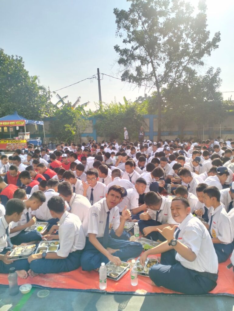 Kekompakan dan Kebahagiaan: Pemandangan siswa putra dan putri yang makan bersama di bawah naungan pohon yang rindang (walaupun di bawah terik matahari pagi) menunjukkan suasana keakraban. Tawa dan obrolan ringan mengiringi santap pagi, mempererat tali silaturahmi antar siswa.