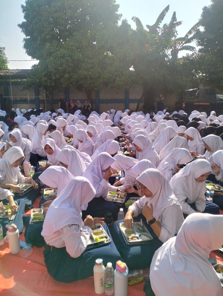 Seluruh siswa serentak membuka makanan sehat yang telah disiapkan. Duduk beralaskan terpal merah, mereka menikmati hidangan dengan piring/nampan yang seragam. Kegiatan ini merupakan wujud nyata dari penanaman kebiasaan gizi seimbang dan kekompakan di lingkungan sekolah.