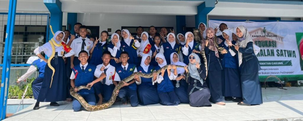 Momen Puncak Keberanian: Puncak dari sesi edukasi ini adalah momen keberanian dan interaksi langsung! Sejumlah siswa dan guru berkesempatan untuk berfoto bersama dengan satwa liar, yaitu seekor ular sanca (Python), yang didampingi oleh petugas ahli. Momen ini bukan sekadar unjuk keberanian, tetapi juga memberikan pengalaman tak terlupakan tentang bagaimana berinteraksi dengan aman dan menghormati keberadaan satwa liar. Foto bersama dengan ular sanca yang melingkar di bahu menjadi bukti semangat siswa-siswi SMPN 236 Jakarta dalam belajar dan mengenal alam lebih dekat.